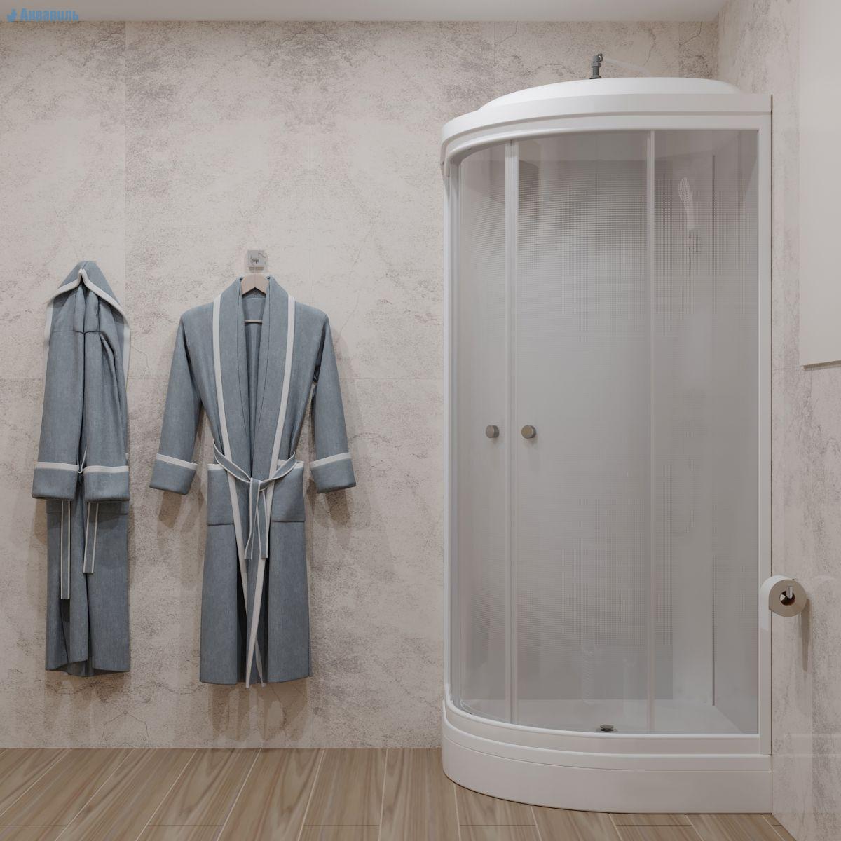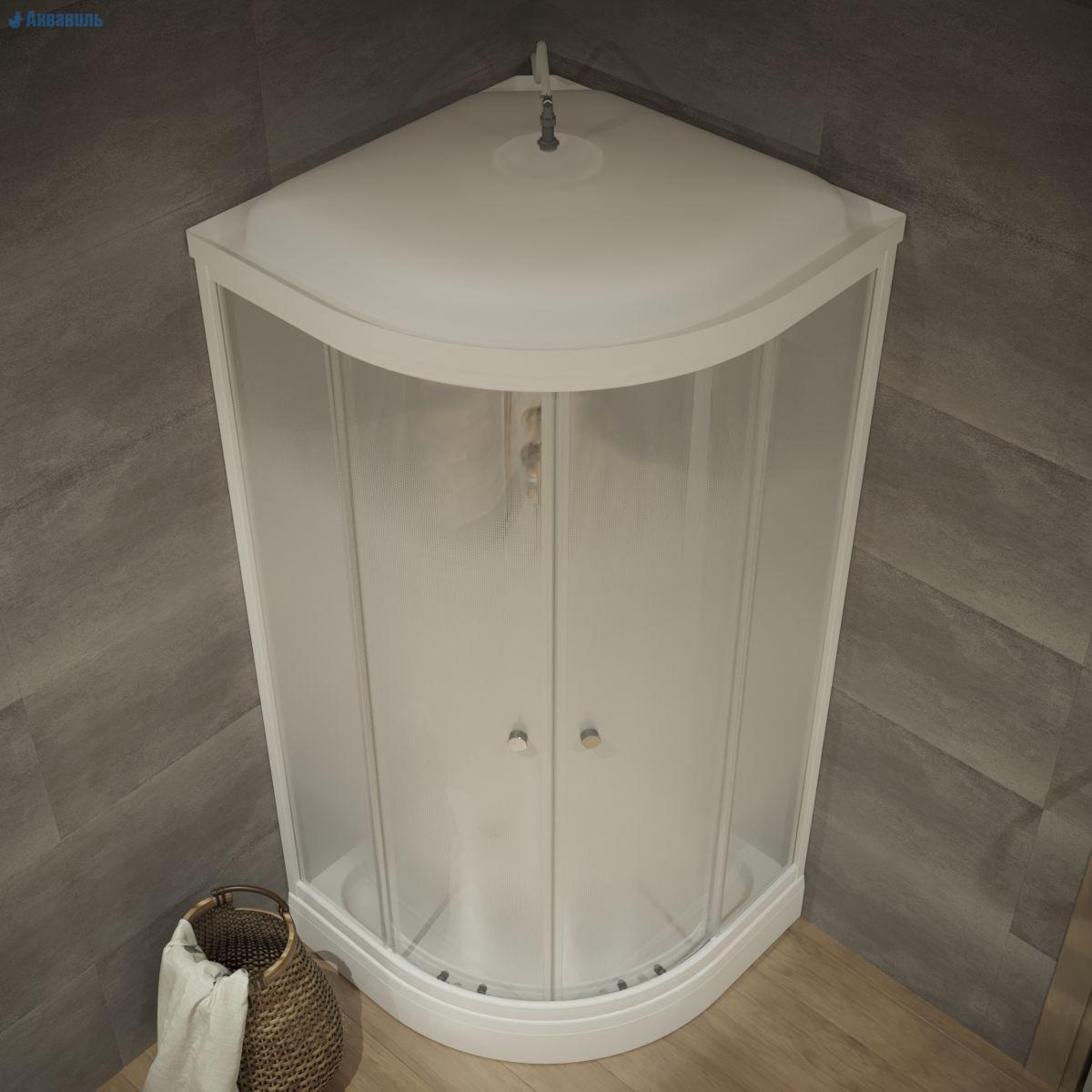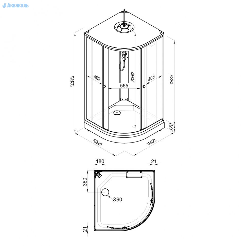 Душевая кабина "Лайт 100х100 А" / лайт с низким поддоном четверть круга, с двумя раздвижными дверями, матовое стекло. Габариты: 1000 х 1000 мм. Высота - 2305 мм., низкий поддон (170 мм.), стекло-рисунок Лайт (толщина 4 мм.), центральная душевая стойка со смесителем с душевой лейкой, верхний тропический душ, стеклянная полочка. Душевой поддон со съемным передним экраном. Стальной каркас. Крыша, сифон, задние стенки.