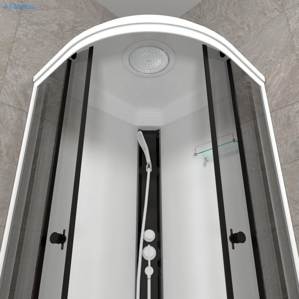 Душевая кабина Тритон Грэй-Вайт 90x90 А на стальном каркасе, с низким поддоном высотой 170 мм., который оснащен сифоном Click-clack d=50 мм. и съемным фронтальным экраном. В комплект так же входит: Крыша с верхним тропическим душем. Центральная черная душевая панель (консоль) с белой душевой лейкой. Задние стенки белые. Комплект направляющих. Передние стекла, и раздвижные двери в светло сером цвете. Форма Полукруг. Тип поддона Низкий. Высота экрана поддона 130 мм. Глубина 65 мм. Ширина дверного проёма 570 мм. Толщина стекла 4 мм. Количество дверей 2 шт. Радиус 556 мм. Цвет профиля Белый. Материал профиля Алюминий. Конструкция дверей Раздвижная. Механизм открытия дверей Ролики скольжения. Максимальная нагрузка 350 кг.