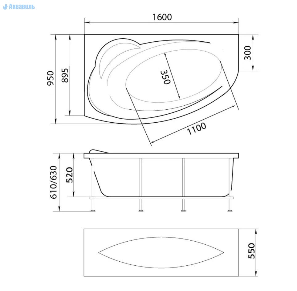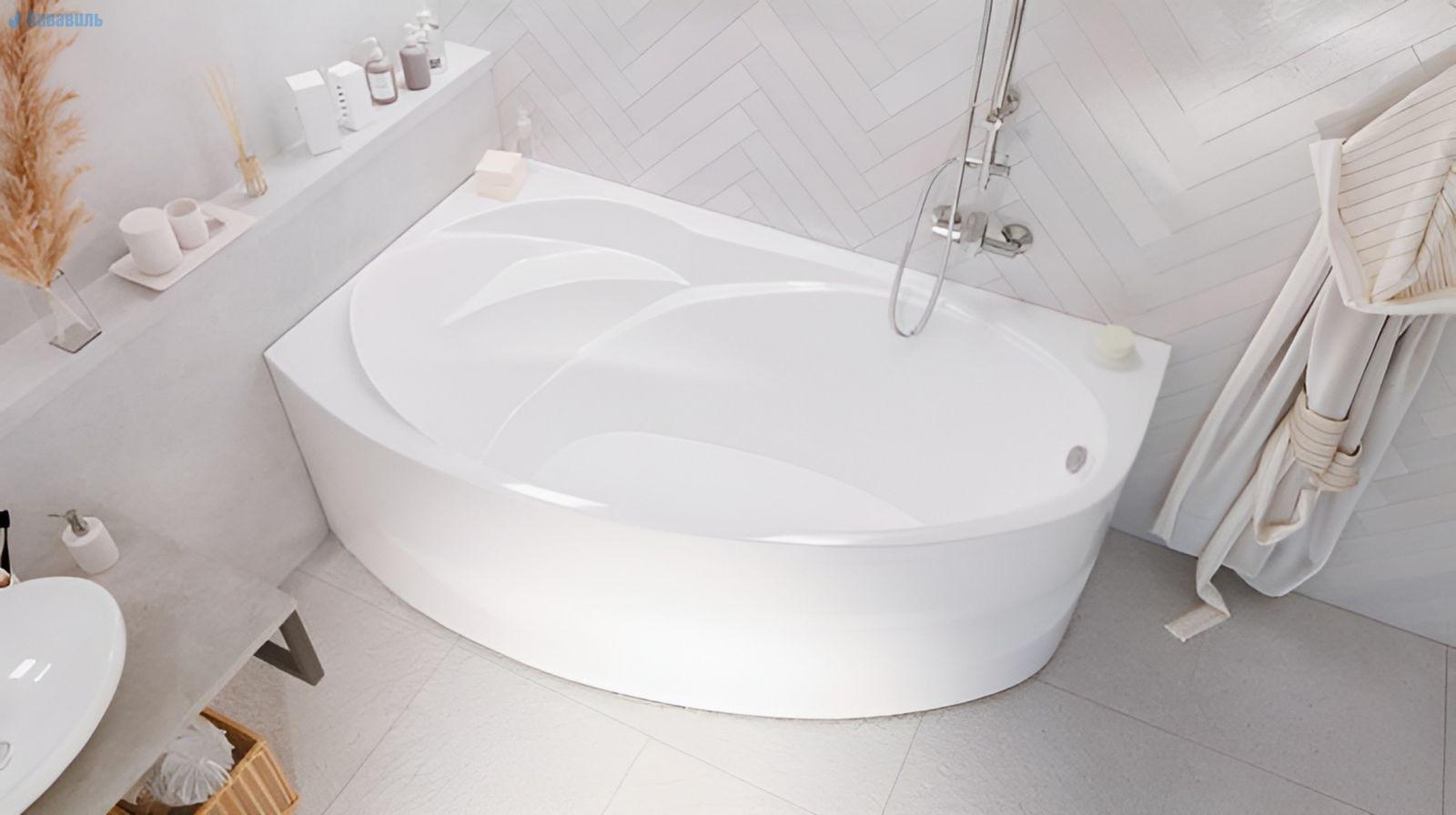 Прекрасно смотрится в установленном виде в углу ванной комнаты. Подходит для установки в подиум.