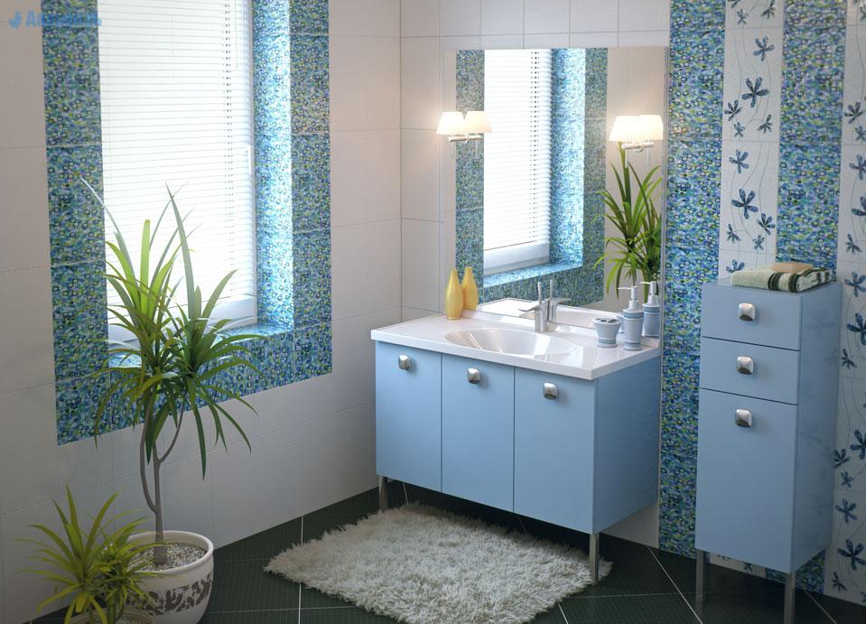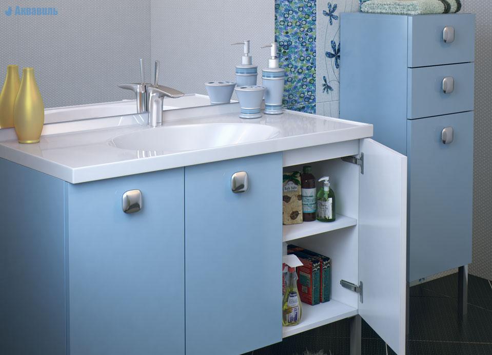 Столешница-умывальник из искусственного мрамора и большое зеркало с подсветкой дают возможность визуально увеличить пространство ванной комнаты. Эта мебель доступна в огромном количестве цветов (около 30-ти вариантов декора)