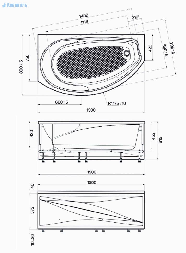 Прекрасно смотрится в установленном виде в углу ванной комнаты. Подходит для установки в подиум.