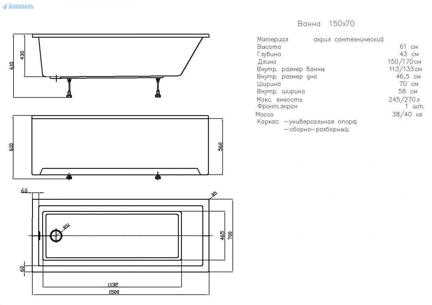 Производитель Акватек Россия. Акриловая ванна София 150х70, прямоугольной
