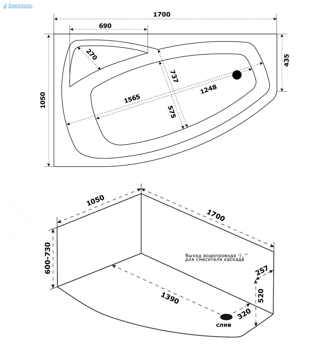 Ванна Камея-Pro 170x105 L, асимметричной формы, белого цвета, и левым вариантом размещения. Идеально подходит для использования в любых ванных комнатах. Изготовлена из 100% литьевого акрила (PMMA) Altuglas (Австрия), толщиной 5 мм.