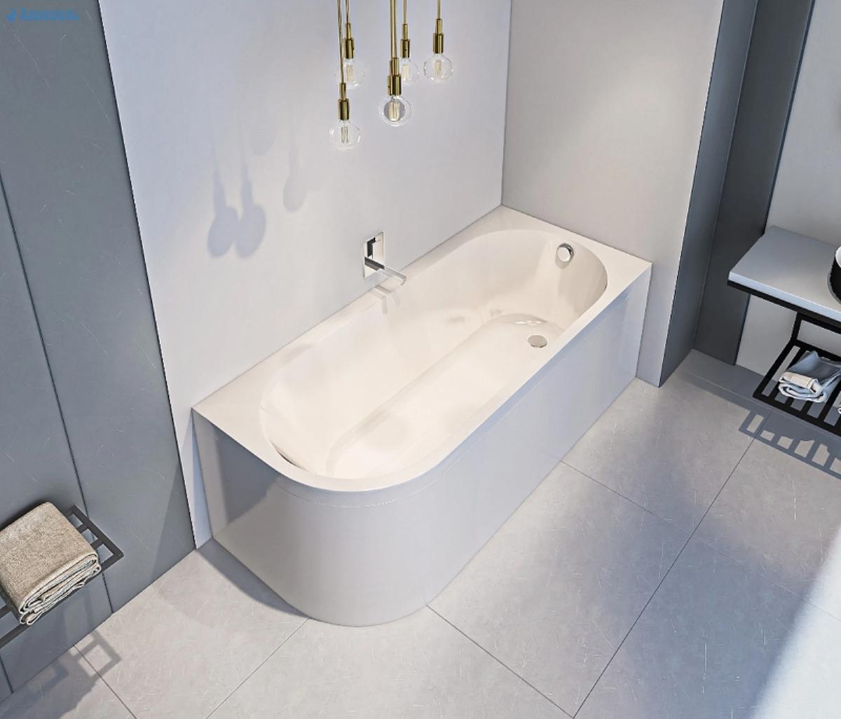 Прекрасно смотрится в установленном виде в углу ванной комнаты. Подходит для установки в подиум.